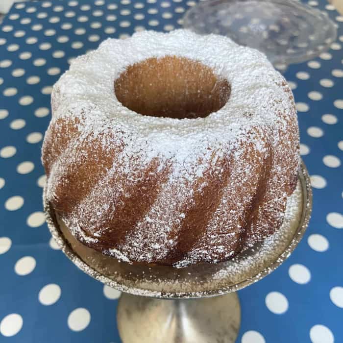 Bestreut wird dieser Gugelhupf nach Franz Joseph I. von Österreich mit reichlich Puderzucker, nämlich mit den 50 Gramm bis zur vollen Packung, wenn du für den Teig 200 Gramm verbraucht hast.