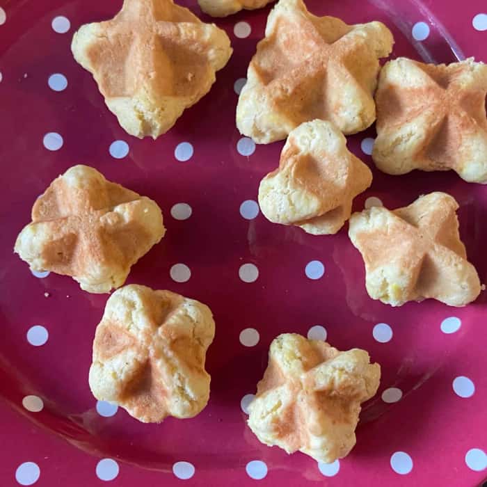 - Kügelchen in Walnussgröße aus dem Teig formen und mit etwas Abstand im Waffeleisen golden backen.