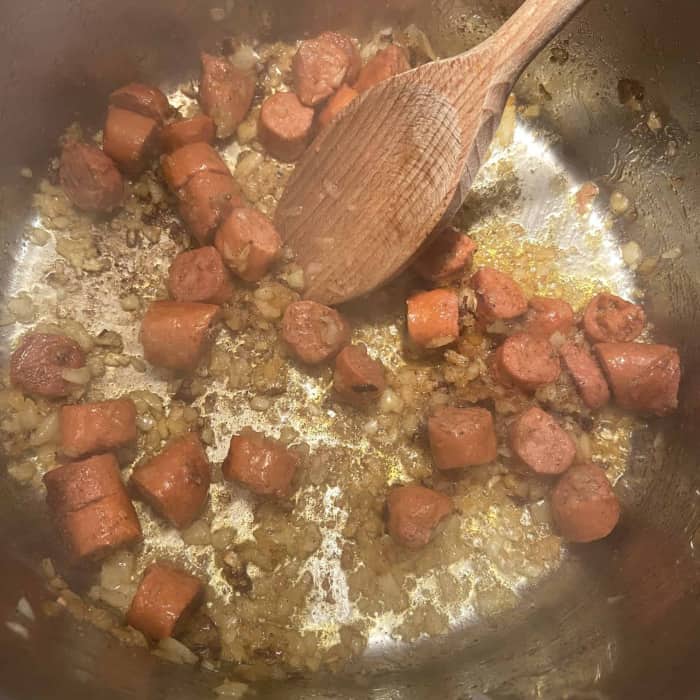 - Olivenöl erhitzen und die Zwiebelstückchen mit den Wurstscheiben anbraten.