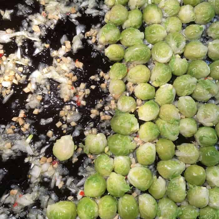 - Den Rosenkohl putzen und blanchieren, dann vorsichtig halbieren und bereitstellen.