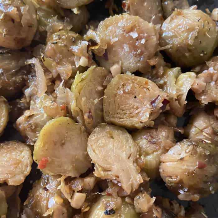 - Der fertige gegarte Rosenkohl vom Blech schmeckt warm und kalt und am nächsten Tag und als Antipasti.